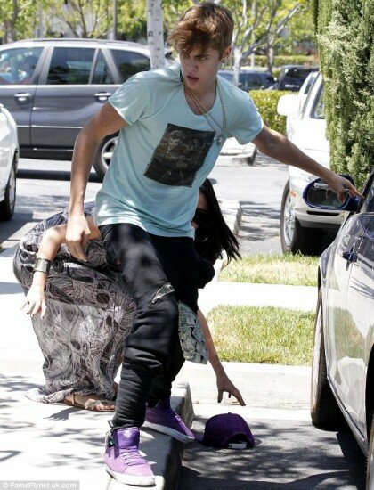Justin Bieber perdió la calma al notar que el fotógrafo fastidiaba a Selena Gomez. La pareja salía de un cine de la zona residencial de Calabasas, en California, el sábado por la tarde.