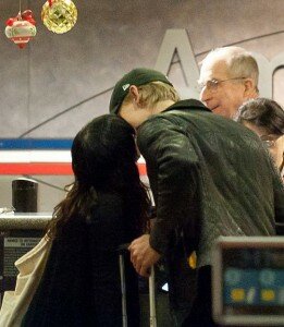 La nueva pareja de Hollywood compartió un dulce beso en el stand de venta de boletos de una reconocida aerolínea, en el aeropuerto de LAX, en Los Ángeles.